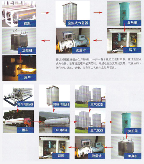 LNG通過槽車運至氣化站,首先利用卸車增壓氣化器對你槽車儲罐內LNG進行升壓,使槽車與LNG儲罐形成一定壓差,利用壓差將槽車中LNG卸入儲罐內。使用時,利用儲罐增壓器將儲罐壓力升高,經過空溫式氣化器(通常情況下,空溫式氣化器為兩臺,開一備一)進行氣化,北方用戶需增配水浴式復熱器從而保證氣化后的氣體溫度大于5℃,在經過調壓、計量、加臭等工藝后,輸入主管網。